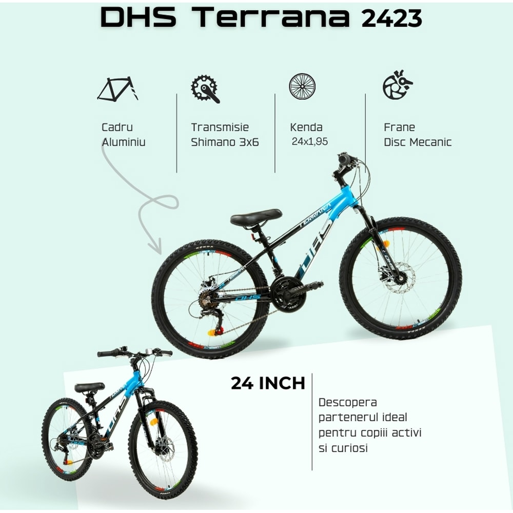 Bicicleta copii DHS Terrana 2423, roata 24", frana disc mecanica, negru-albastru