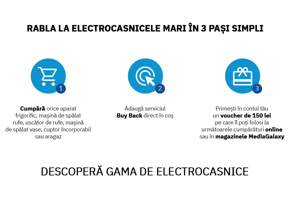 - Cumpara produsele din categoria electrocasnice mari precum: aragazuri si seturi built-in, aparate frigorifice, masini de spalat si uscatoare de rufe, masini de spalat vase, adauga serviciul buy back din cos selectand ,,Preluare Buy Back”, si primesti un voucher de 150 de lei pe care il poti folosi la orice comanda viitoare pe site-ul nostru. Voucherul va fi disponibil in Contul de client la sectiunea “Carduri cadou si cupoane”. Bucura-te de noile tale produse prin program.