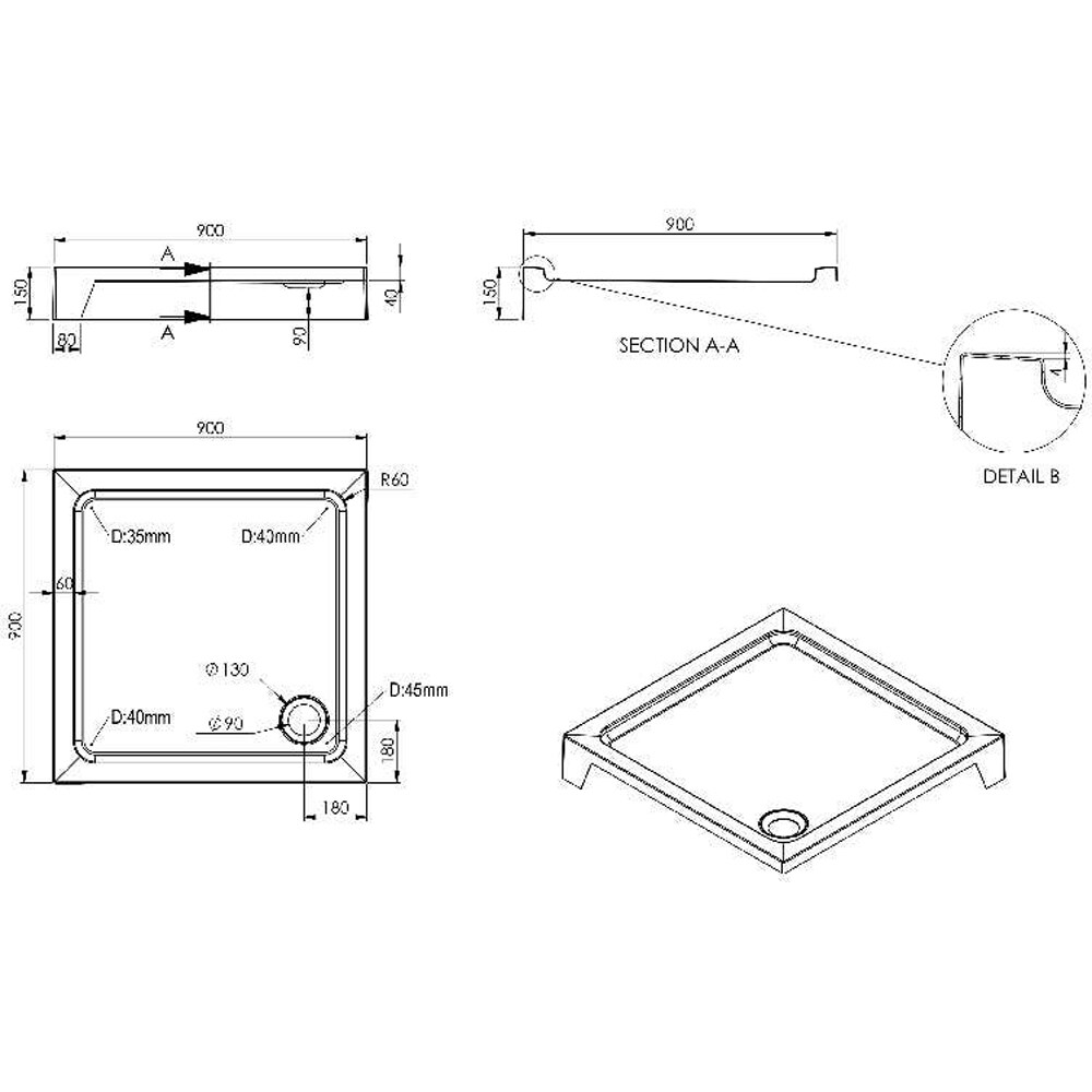 Cadita dus Dommel, patrata, ABS si acril, 90 x 90 x 15 cm, alb