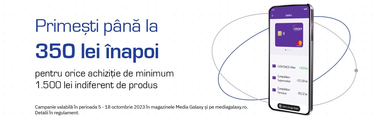 Cumpara de la Media Galaxy pana pe 18 octombrie si poti primi pana la 350 lei inapoi, pe aplicatia Credex Pay