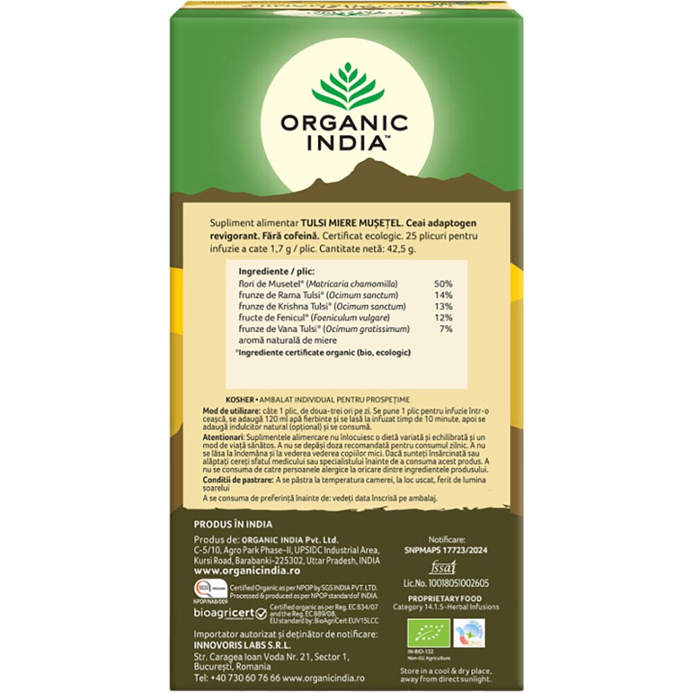 Ceai ORGANIC INDIA Tulsi Miere si Musetel, 25 plicuri, 42.5g