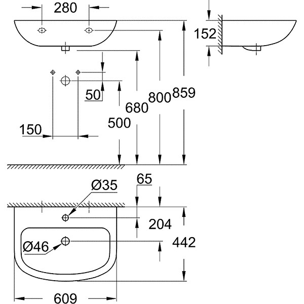 Chiuveta baie GROHE Bau Ceramic 39421000, montare pe perete, 60.9 x 44.2 cm, alb