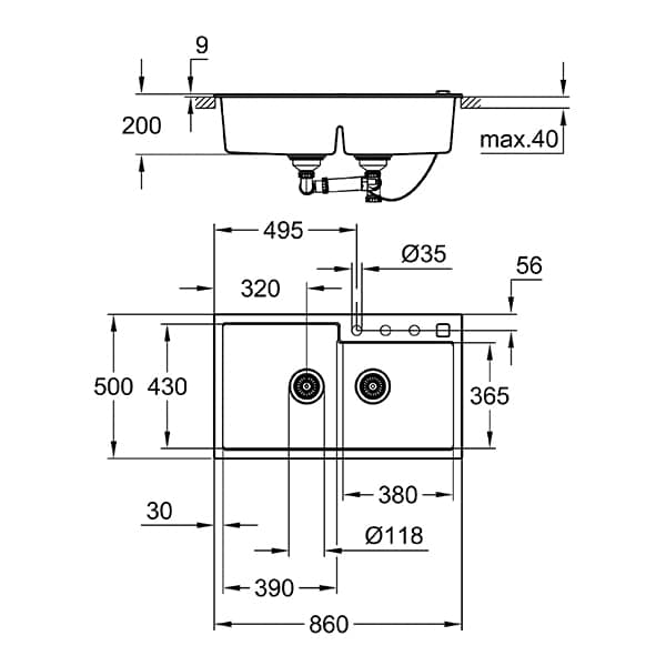 Chiuveta bucatarie GROHE K500 31649AP0, 2 cuve, montaj dreapta, compozit quartz, negru