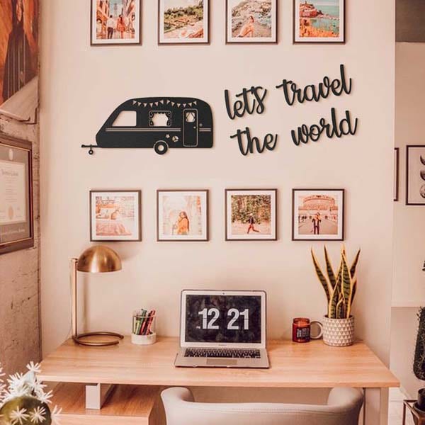 Decoratiune perete Let's Travel The World, 20 x 8 cm, metal, negru