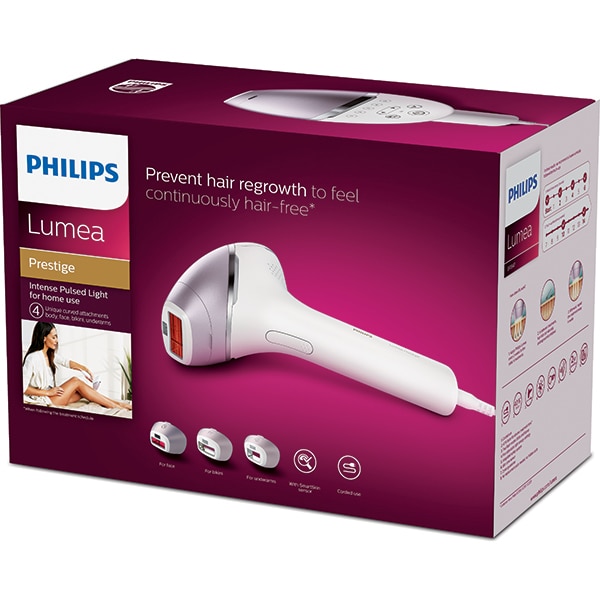 Epilator IPL PHILIPS Lumea Prestige Seria 8000 BRI947/00, 450.000 de impulsuri, 4 accesorii, senzor SmartSkin, retea, argintiu