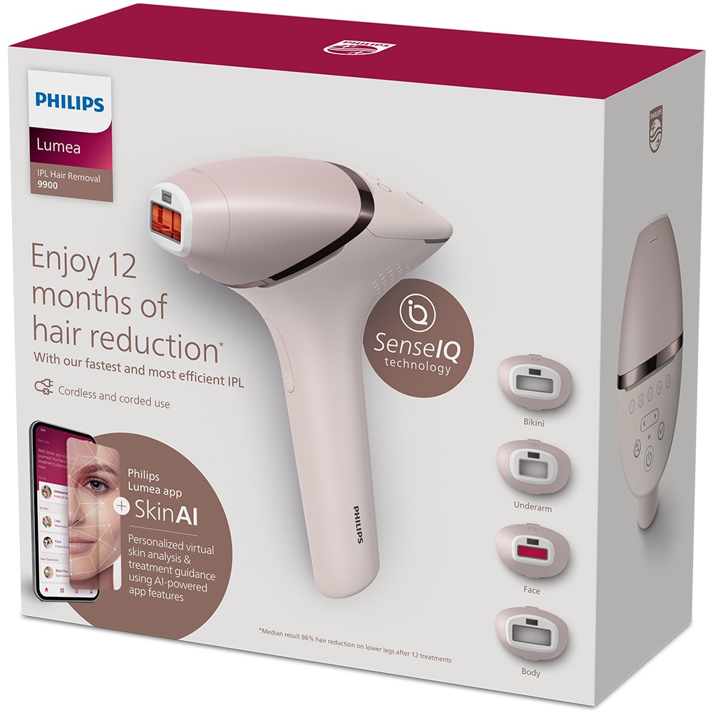 Epilator IPL PHILIPS Lumea Series 9900 BRI976/00, 450.000 de impulsuri, 4 accesorii, Senzor SmartSkin, acumulator, roz