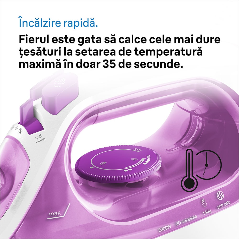 Fier de calcat BRAUN TexStyle 3 SI3030PU, 2300W, 140g/min, 270ml, talpa SuperCeramic, mov-alb