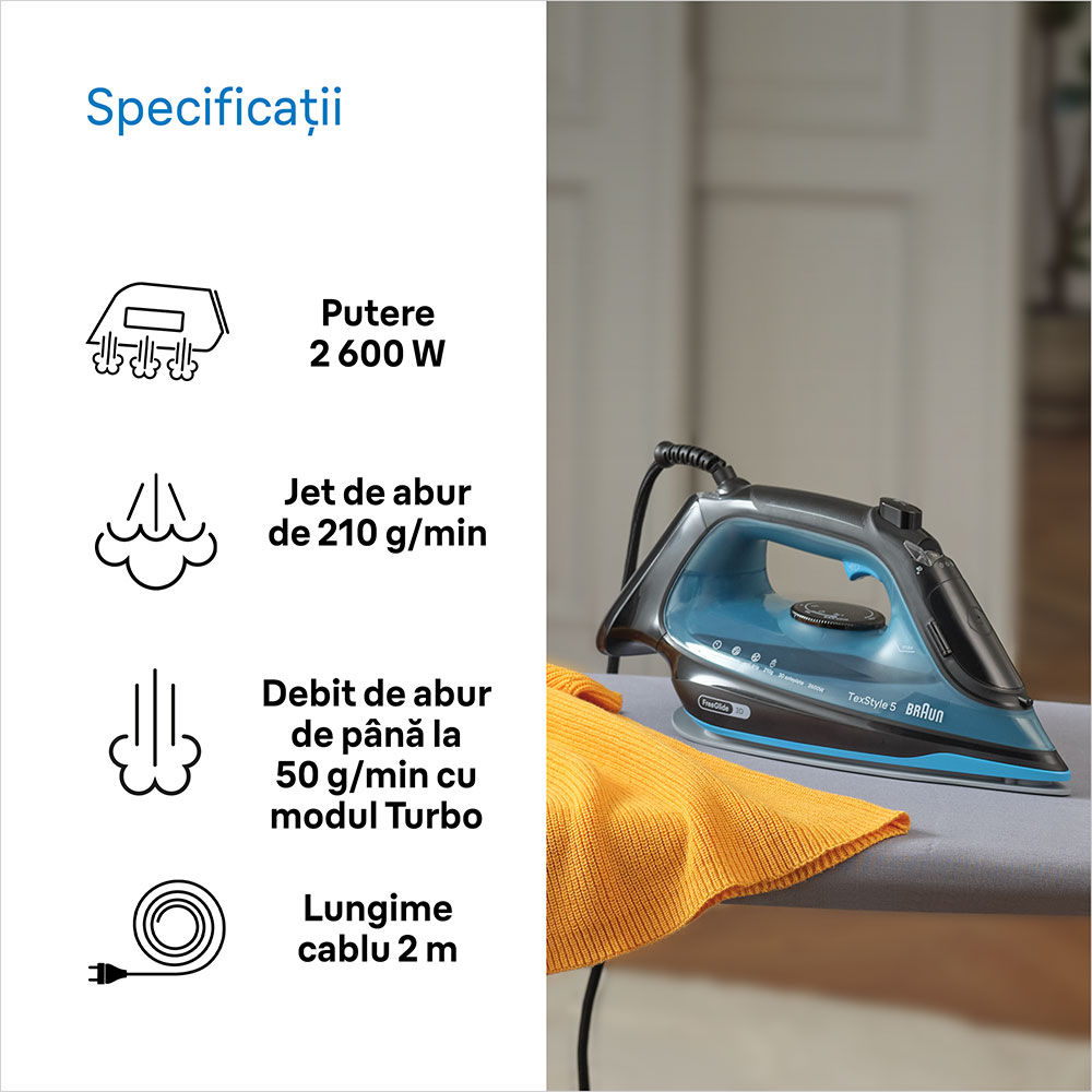 Fier de calcat BRAUN TexStyle 5 SI5256BL, 2600W, 210g/min, 300ml, talpa SuperCeramic, albastru-negru