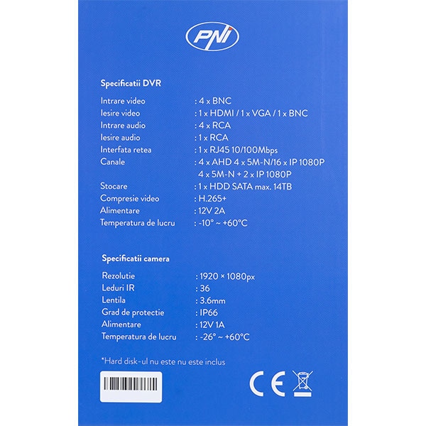 Kit supraveghere PNI House PTZ1300, 4 camere Full HD, NVR, 8 canale, alb-negru