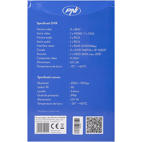 Kit supraveghere video PNI House PTZ1500, 4 camere UHD 1920p, DVR, 4 canale, alb-negru