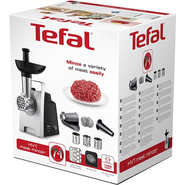 Masina de tocat carne TEFAL NE109838, 1.7kg/min, 1400W, accesoriu carnati/suc de rosii/feliere/radere, argintiu-negru