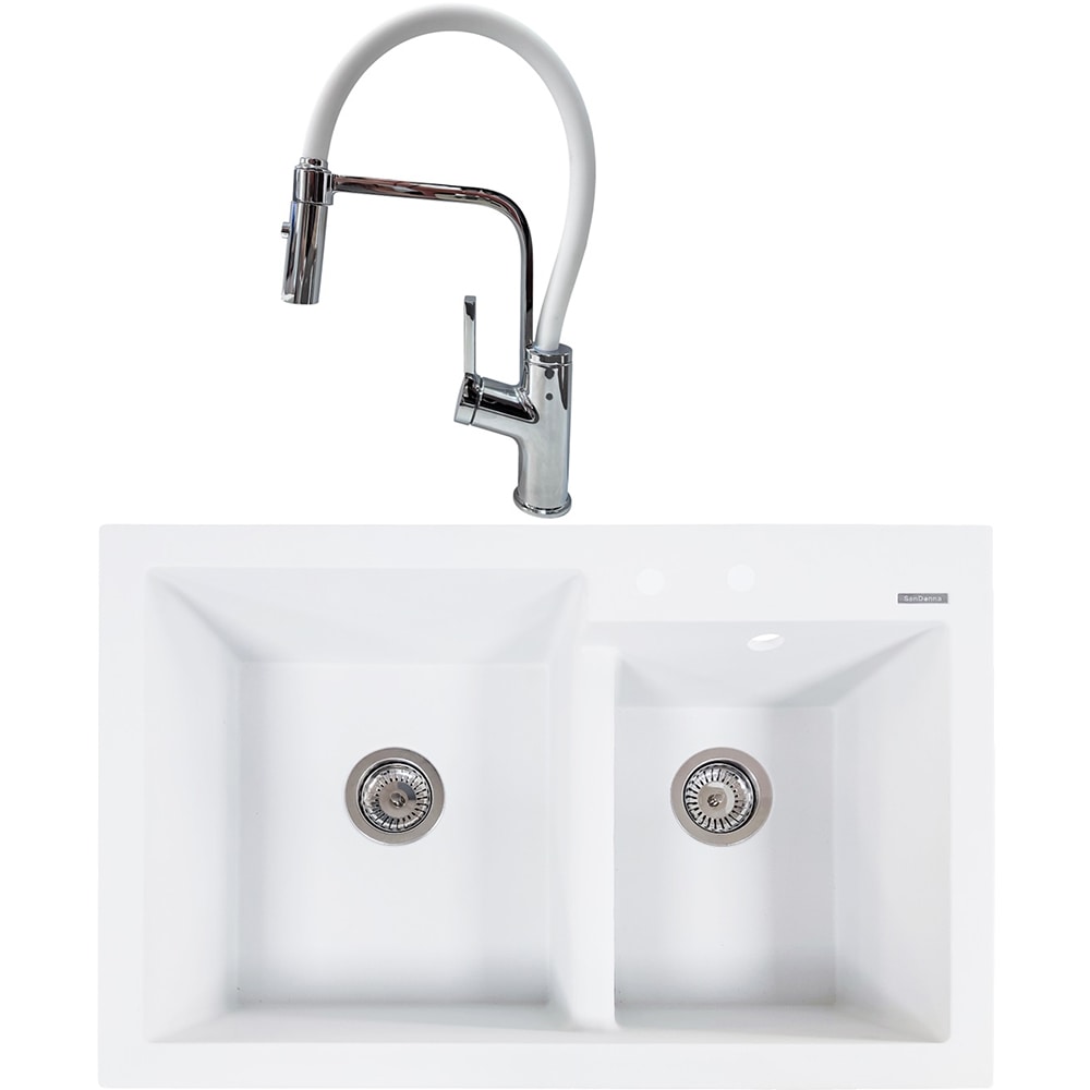 Pachet chiuveta SANDONNA Edyta 79, 2 cuve, compozit granit + baterie, alb