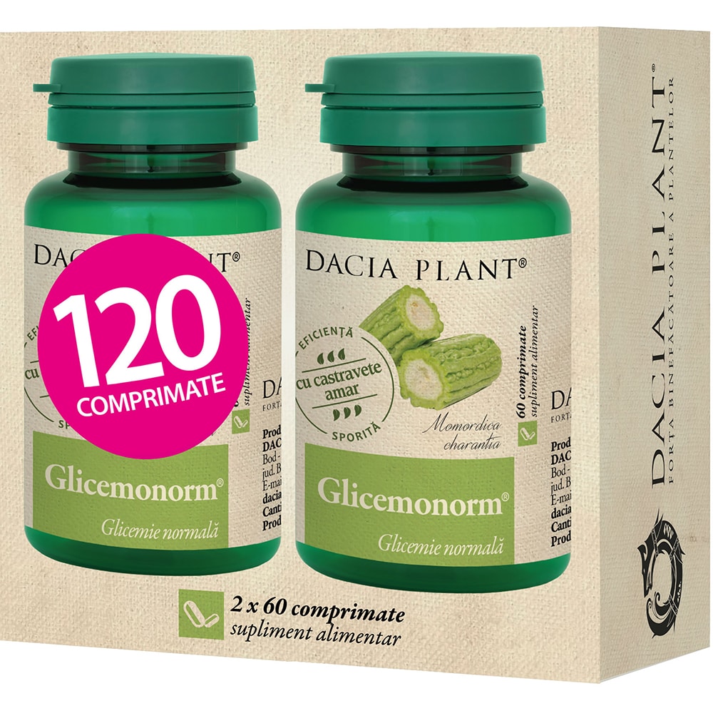 Pachet supliment alimentar Glicemonorm, 2 x 60 comprimate, DACIA PLANT