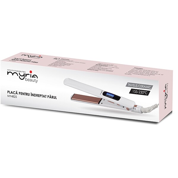 Placa de indreptat parul MYRIA MY4825, 230 grade, LED, invelis ceramic, alb-roz