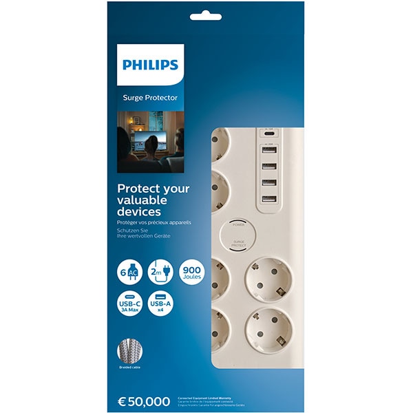 Prelungitor cu protectie PHILIPS SPN7060WA/58, 6 prize, 5 x USB, 2m, Protectie copii, alb