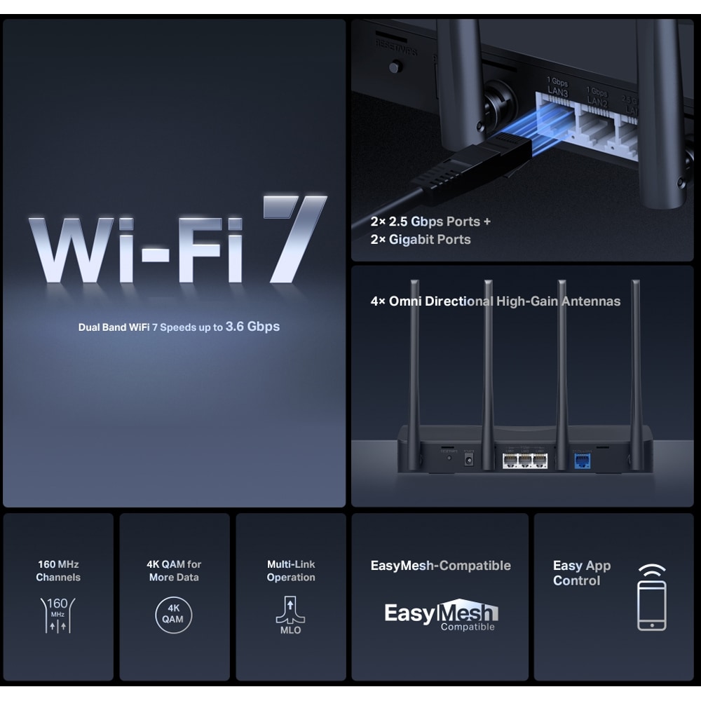 Router Wireless Gigabit MERCUSYS MR27BE BE3600, WI-Fi 7, Dual Band 688 + 2880 Mbps, negru
