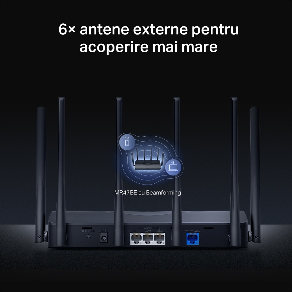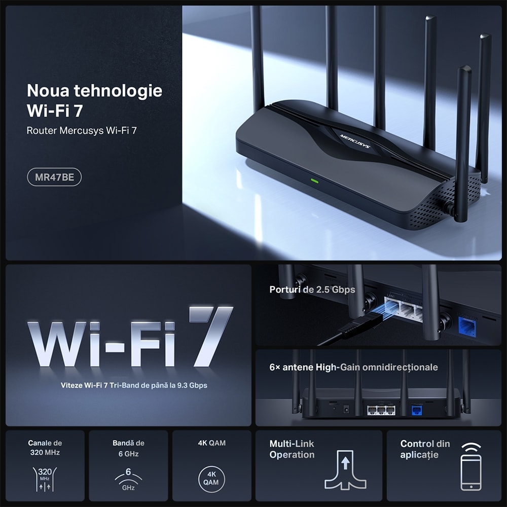 Router Wireless Gigabit MERCUSYS MR47BE BE9300, WI-Fi 7, Tri Band 574 + 2880 + 5760 Mbps, negru