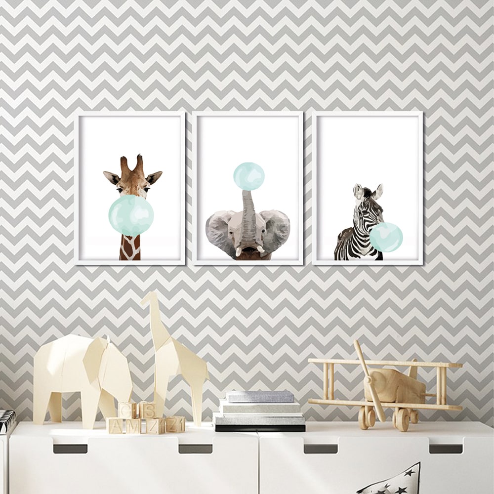 Set 3 tablouri cu rama Animale, 23 x 33 cm, PVC, bleu