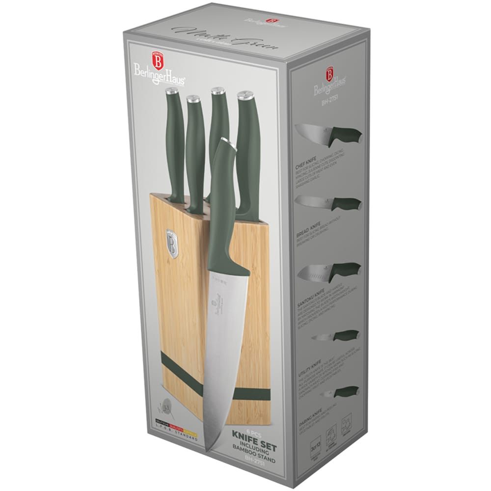 Set cutite BERLINGER HAUS BH/2751 + suport bambus, 5 piese, otel, 9-20cm, verde