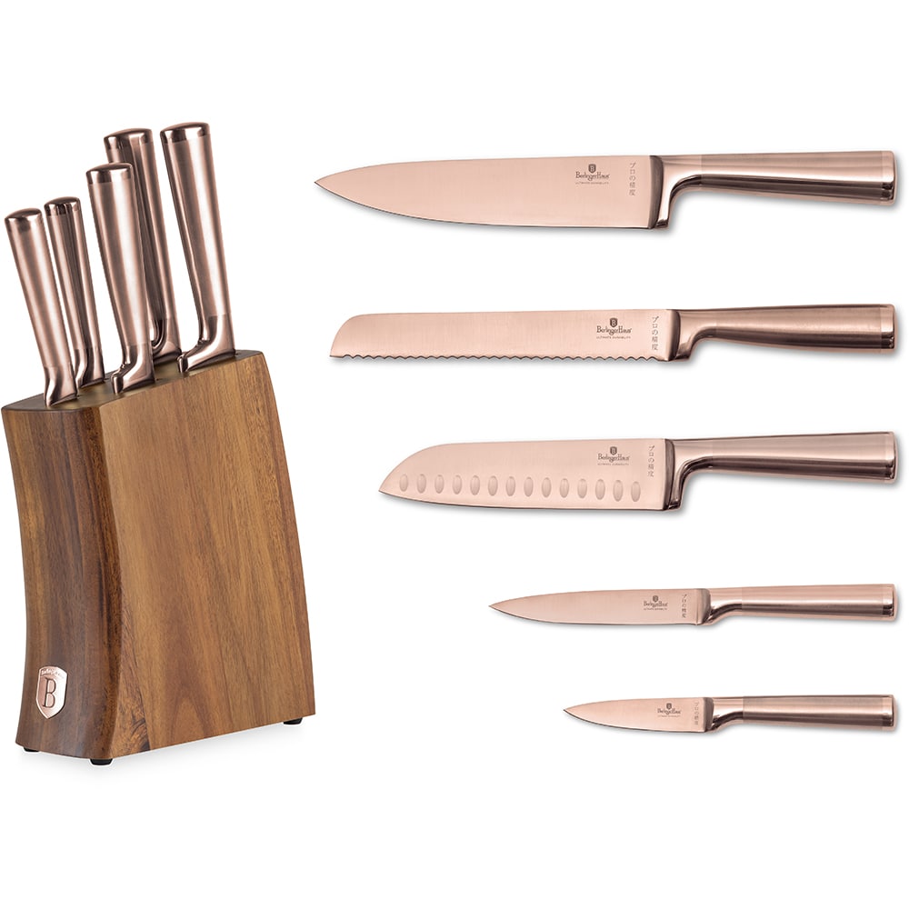 Set cutite BERLINGER HAUS BH/3126 + suport lemn, 5 piese, otel, 9-20cm, rose gold