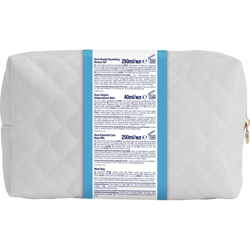 Set ingrijire corp DOVE: Gel de dus Deeply Nourishing, 250ml + Deodorant stick Original, 50ml + Lotiune de corp Essential Care, 250ml + geanta