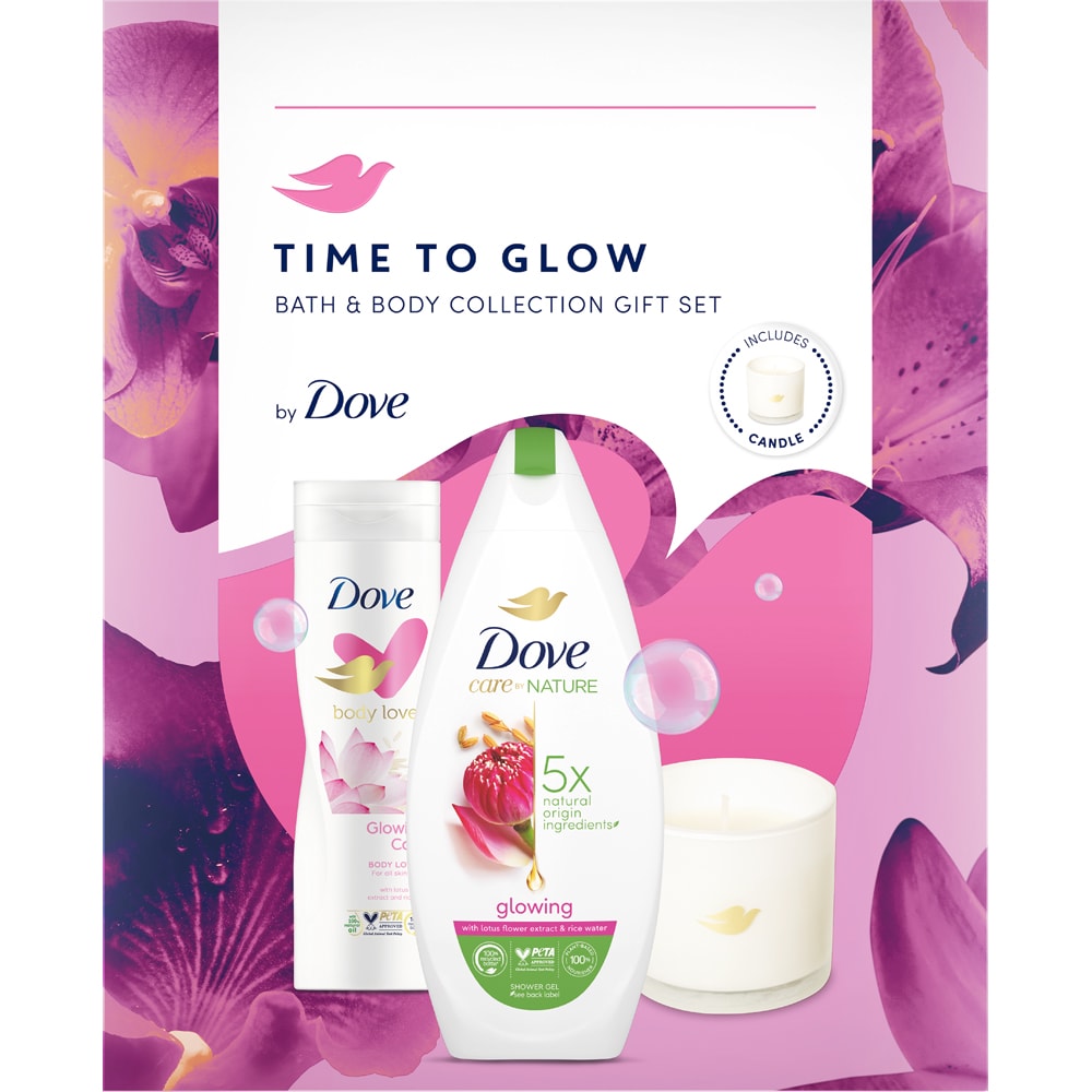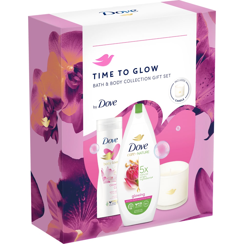 Set ingrijire corp DOVE Glowing: Gel de dus, 225ml + Lotiune de corp, 250ml + Lumanare parfumata