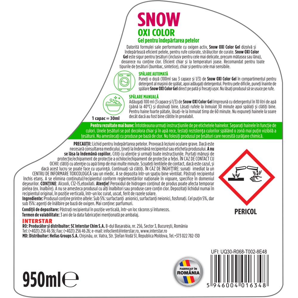 Solutie pentru indepartarea petelor SNOW Oxi Color Gel, 950 ml