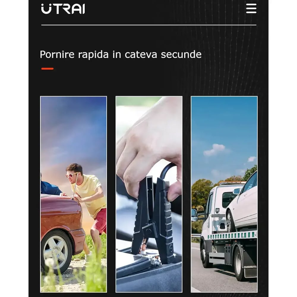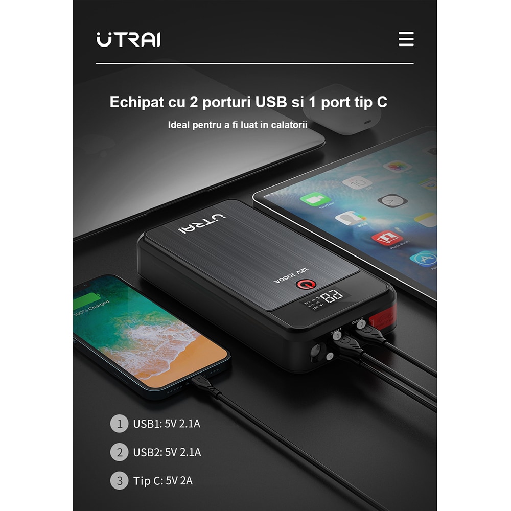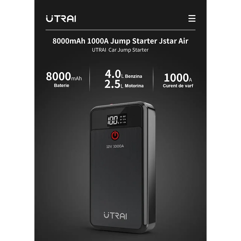 Starter auto UTRAI Jstar Air, 12V, 1000A, 8000mAh, USB, Lanterna, negru