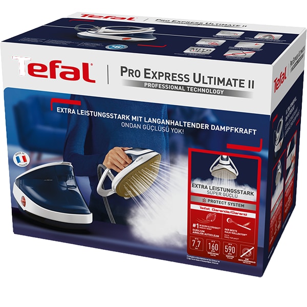 Statie de calcat TEFAL Pro Express Ultimate GV9712E0, 3000W, 590g/min, 1200ml, talpa Durilium, albastru-alb