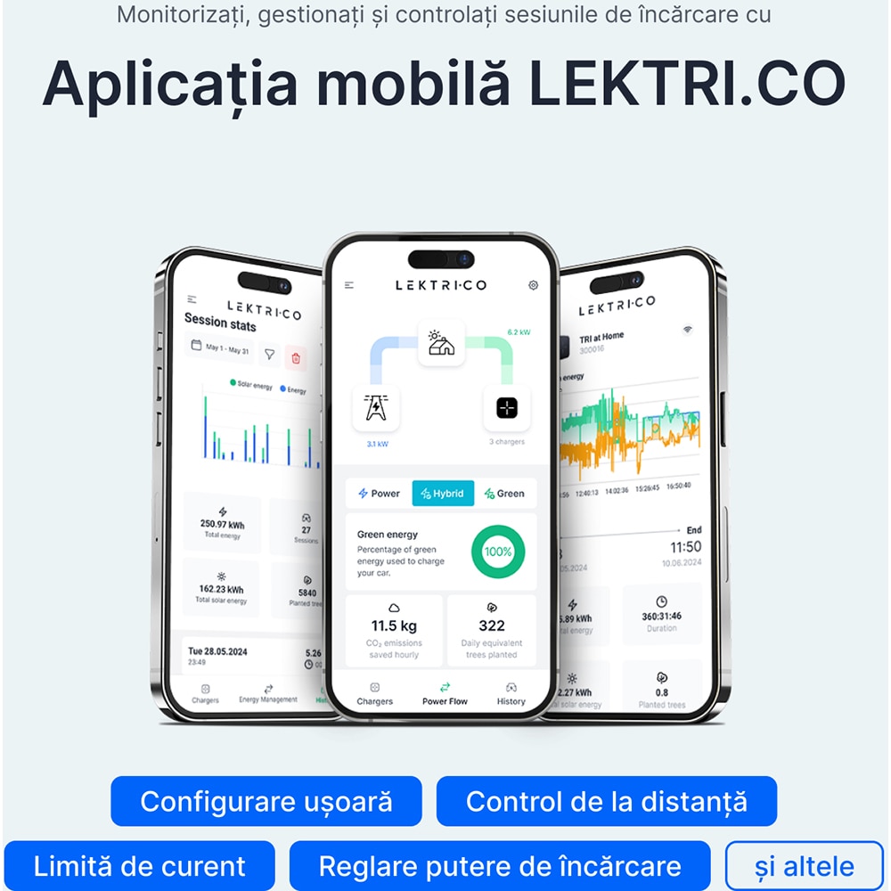 Statie incarcare masini electrice LEKTRI.CO One Safe, monofazat 7.4kW, 32A, Type 2, cablu 5m, Wi-Fi, negru
