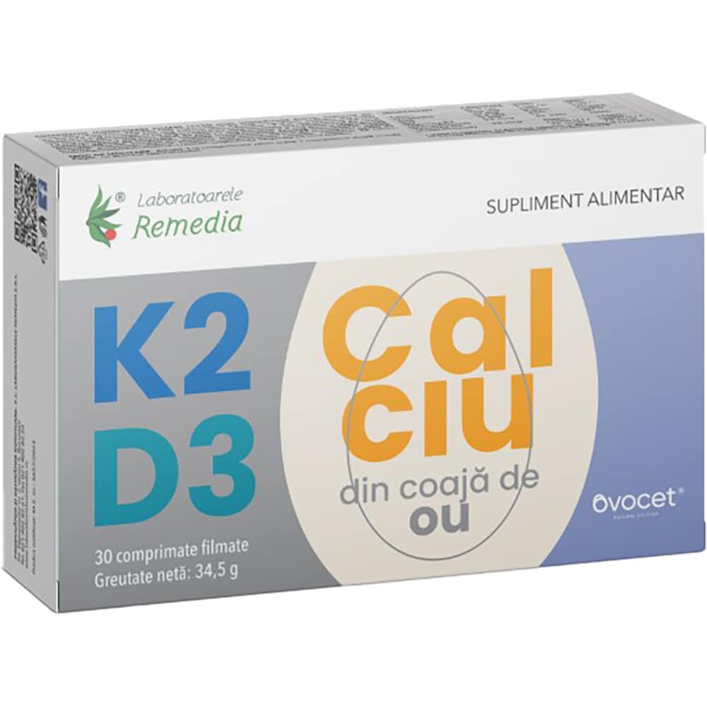 Supliment alimentar K2+D3+Calciu din coaja de ou, 30 comprimate, LABORATOARELE REMEDIA