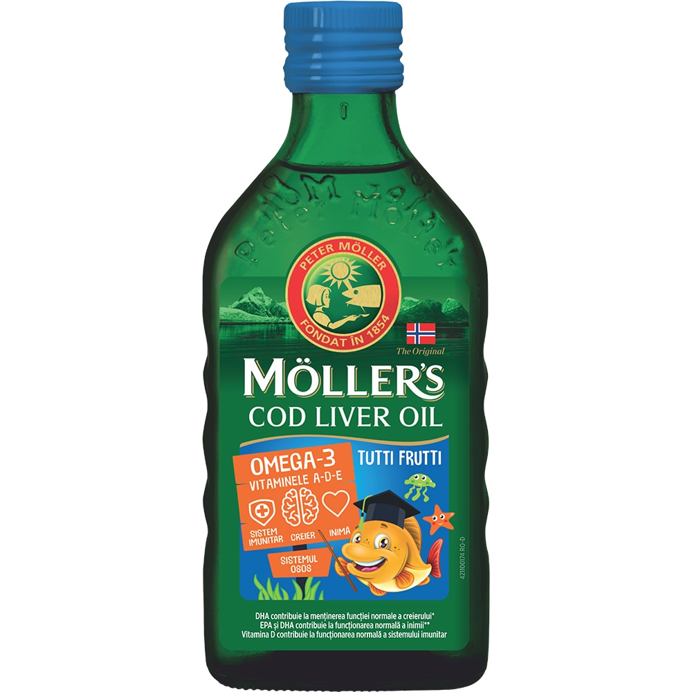 Supliment alimentar Omega 3 Ulei ficat de cod cu aroma tutti frutti, 250 ml, MOLLERS