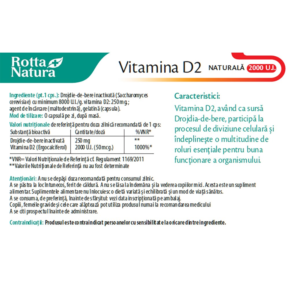 Supliment Vitamina D2 naturala 2000 U.I, 30 capsule, ROTTA NATURA