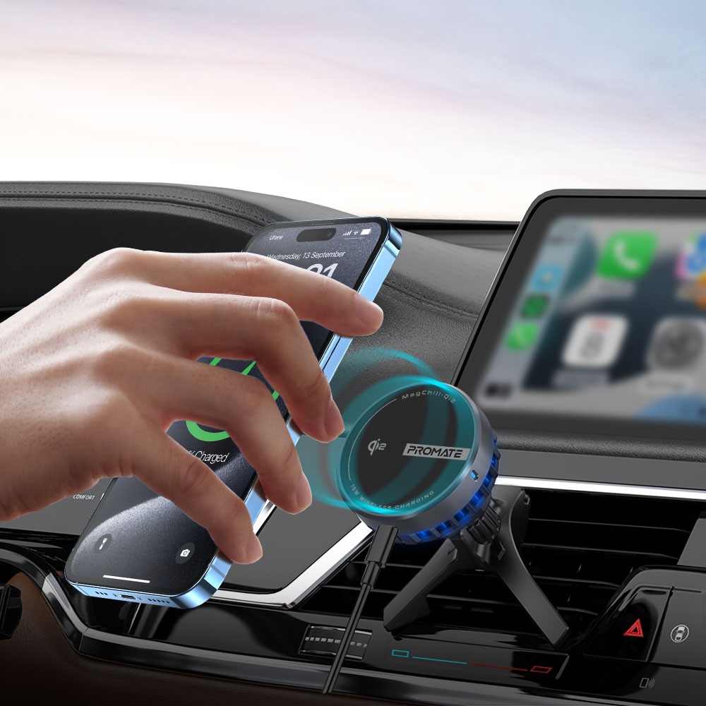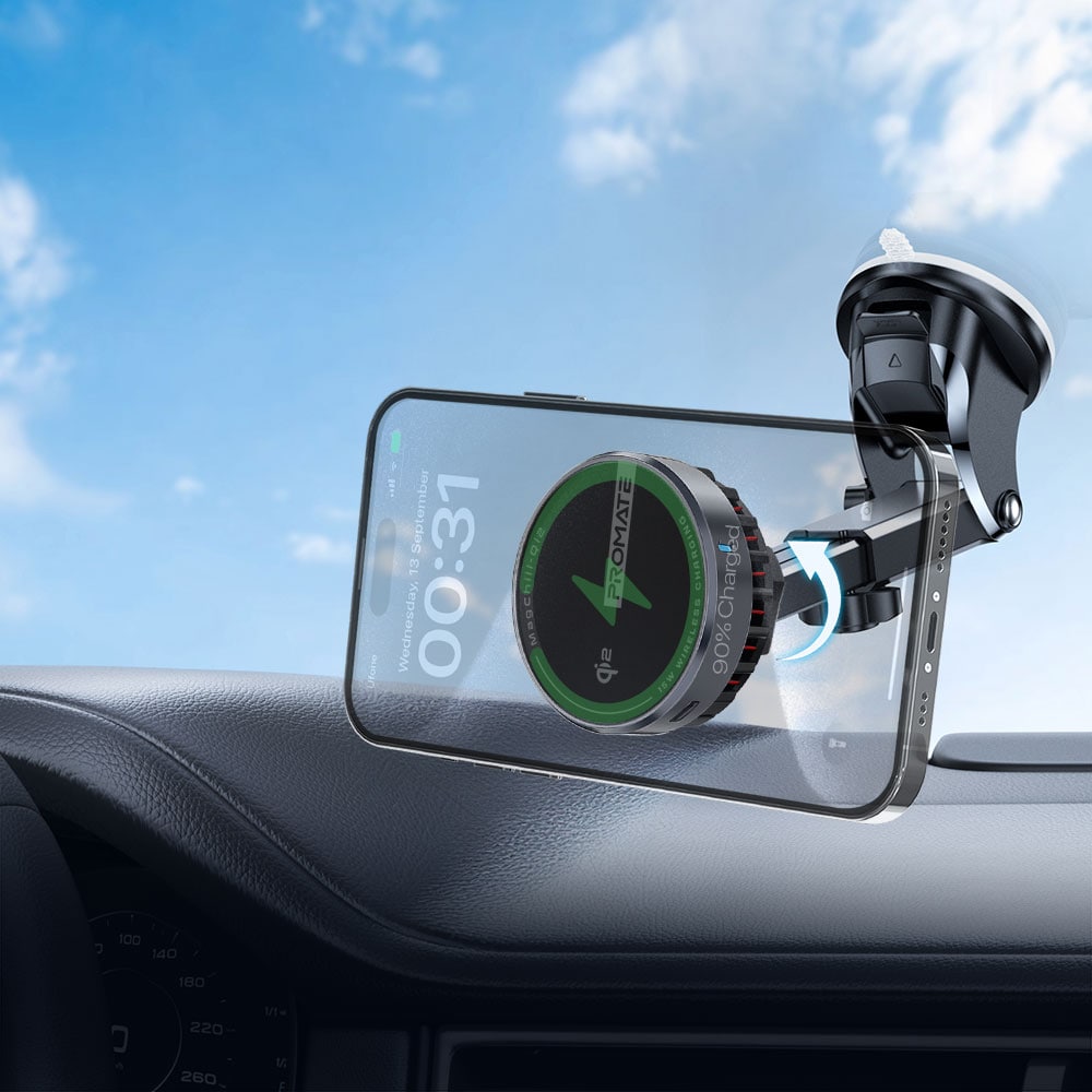 Suport auto cu incarcare wireless PROMATE MagChill-Qi2, parbriz/ventilatie, MagSafe 15W, negru