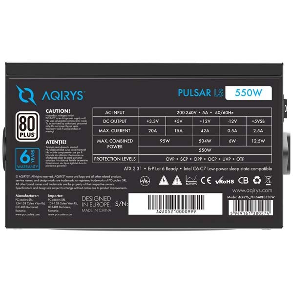 Sursa PC AQIRYS Pulsar, 550W, 120mm, 80 PLUS White
