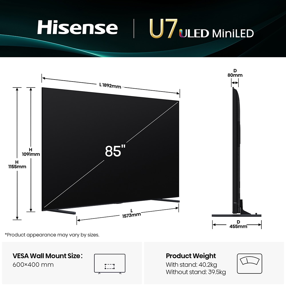 Televizor Mini-LED ULED Smart HISENSE 85U7Q, Ultra HD 4K, 215cm