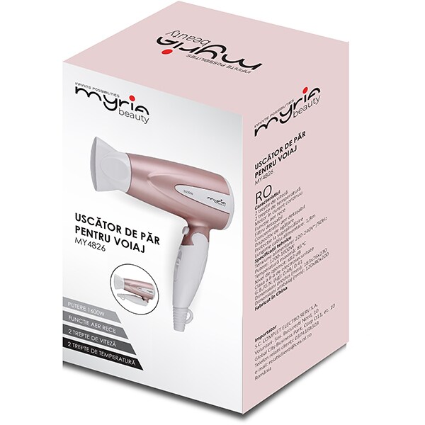 Uscator de par MYRIA MY4826, 1600W, 2 viteze, 2 trepte temperatura, alb-roz