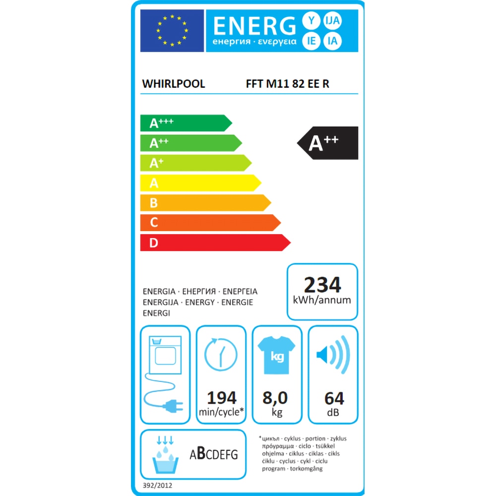 Uscator de rufe WHIRLPOOL FFT M11 82 EE R, 6th Sense, Pompa de caldura, 8 kg, 15 programe, Clasa A++, alb